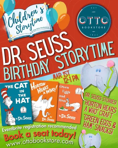 Join us on Sunday, March 1st from 12–1 PM for storytime at The Otto Bookstore celebrating Dr. Seuss' Birthday!